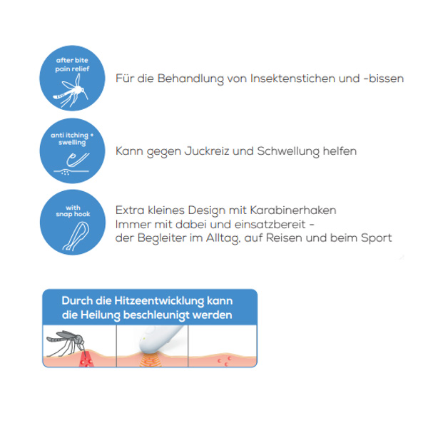Mit dem praktischen Karabinerhaken des Insektenstichheilers ist die erste Hilfe gegen Juckreiz nur einen Handgriff entfernt. Insektenstichheiler einfach 3 Sekunden auf den Stich halten und schon wird der Juckreiz gelindert.