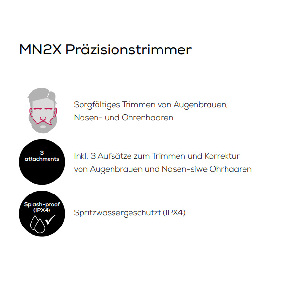- Inkl. 3 Aufsätzen zum Trimmen und Formen von Augenbrauen, Nasen- und Ohrhaaren