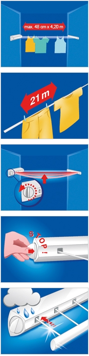 21 Meter Trockenlänge stellt der Rollfix 210 Wandtrockner von Leifheit zur Verfügung. Dazu lassen sich die fünf Leinen des Leifheit Wandtrockners bis zu vier Meter stufenlos ausziehen. Die komfortable Nachspann-Automatik sorgt dafür, dass die Leinen immer straff sind und die Trockenwäsche nicht durchhängt. Bis zu zwei Waschmaschinenladungen finden auf dem ausziehbaren Leifheit Wandtrockner Rollfix 210 Platz.