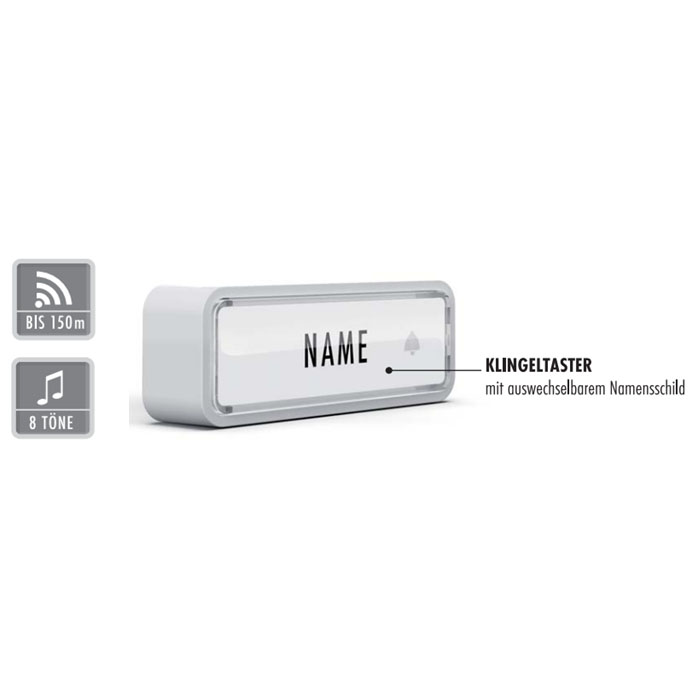 - 8 Klingeltöne am Klingeltaster (Sender) wählbar – ermöglicht einfache Unterscheidung bei Verwendung von mehreren Klingeltastern durch verschiedene Klingeltöne
