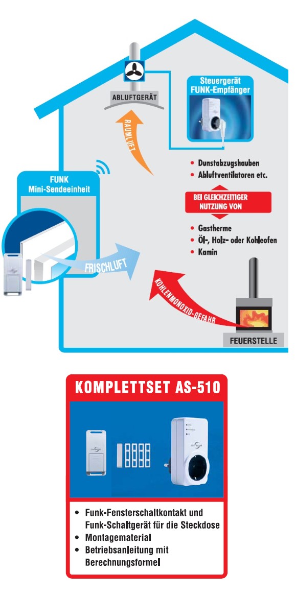 Durch die einfache Montage der FUNK-Abluftsteuerung AS-510 können angeschlossene Geräte, wie z. B. Dunstabzugshauben oder Ventilatoren, nur bei geöffnetem Fenster betrieben werden.