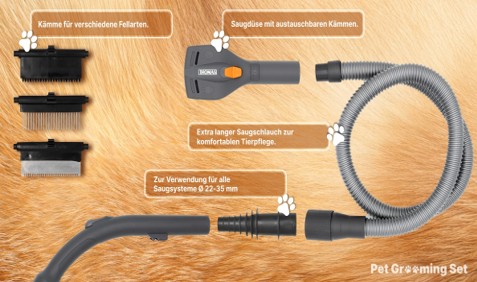 NICHT im Lieferumfang enthalten !* Umfangreiches Zubehör für jede Fellpflege Das THOMAS Fellpflege-Set bietet alles, was du für eine sanfte und gründliche Pflege deines Vierbeiners benötigst: einen 160 cm langen Schlauch, 3 verschiedene Kämme für unterschiedliche Felltypen sowie einen praktischen Adapter, für den Anschluss an alle Saugsysteme Ø 22-35 mm. |