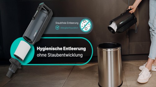 Während bei den meisten Stiel-Staubsaugern beim Entleeren Staub und Schmutz in die Luft gelangen, entsorgst du den Beutel einfach und kontaktlos im Hausmüll. Das ermöglicht eine hygienische Entleerung ganz ohne Staubwolke.