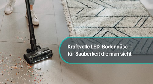 Die motorisierte LED-Bodendüse des kabellosen Stiel-Staubsaugers ist ein echtes Kraftpaket und dabei äußerst komfortabel.